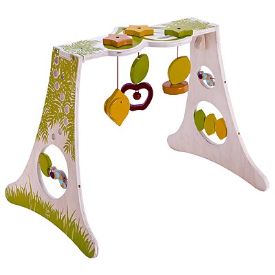 Hape Wooden Baby Gym£29.95, birth+Eco-conscious parents will appreciate this FSC-certified wooden play gym with woodland-inspired fruit to kick and leaves to spin. |